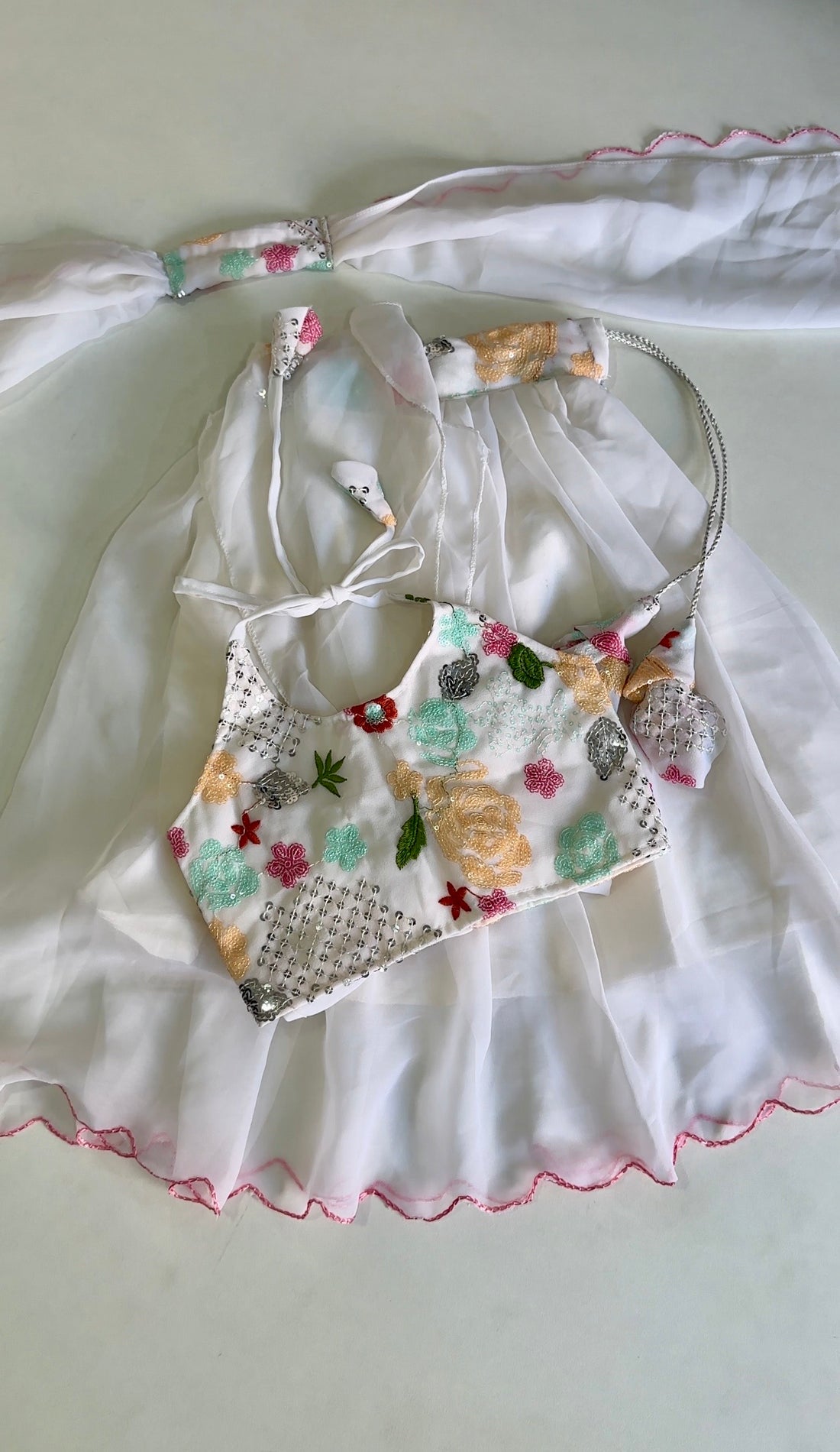 The Senorita is a designer kids' lehenga featuring a high halter neck, crafted to combine...
