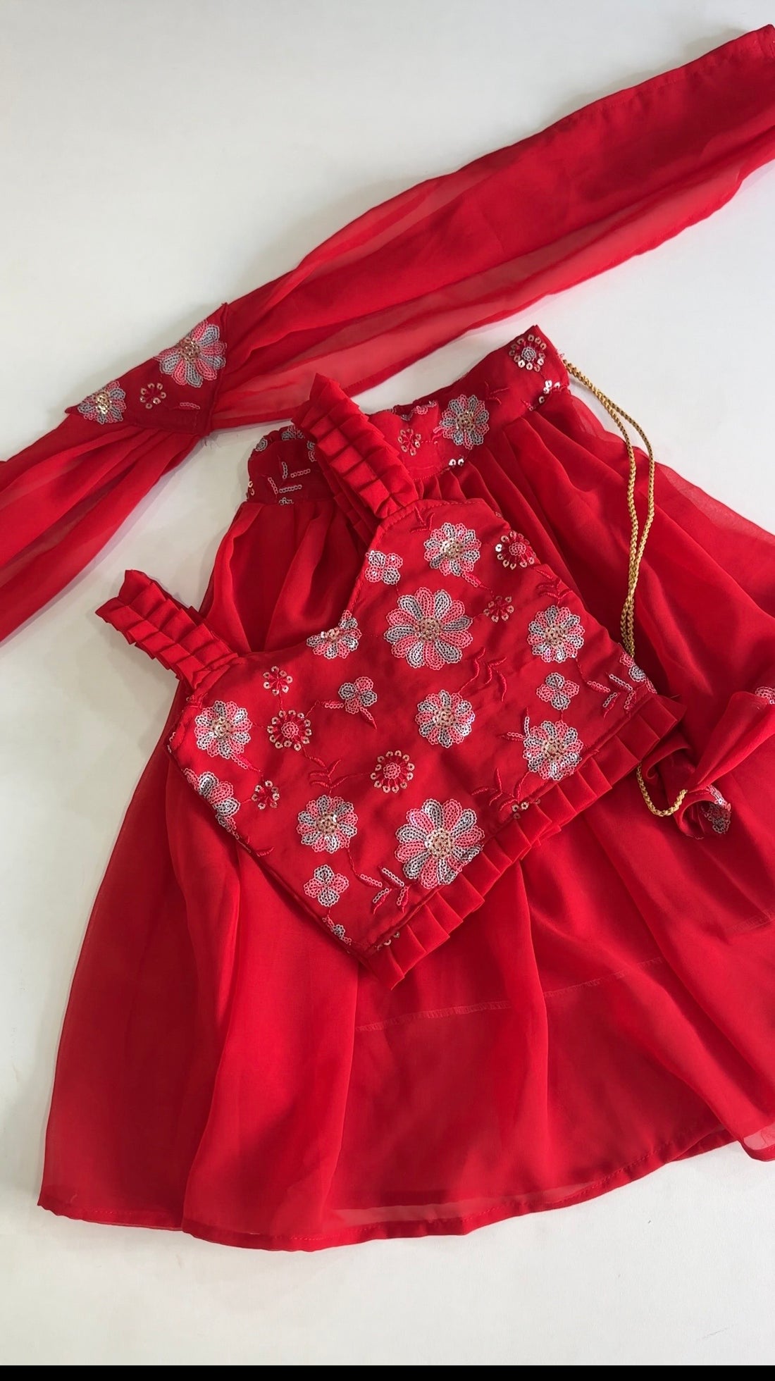 The Red Georgette Handwork Kids Lehenga features a vibrant red hue and intricate handwork, crafted...