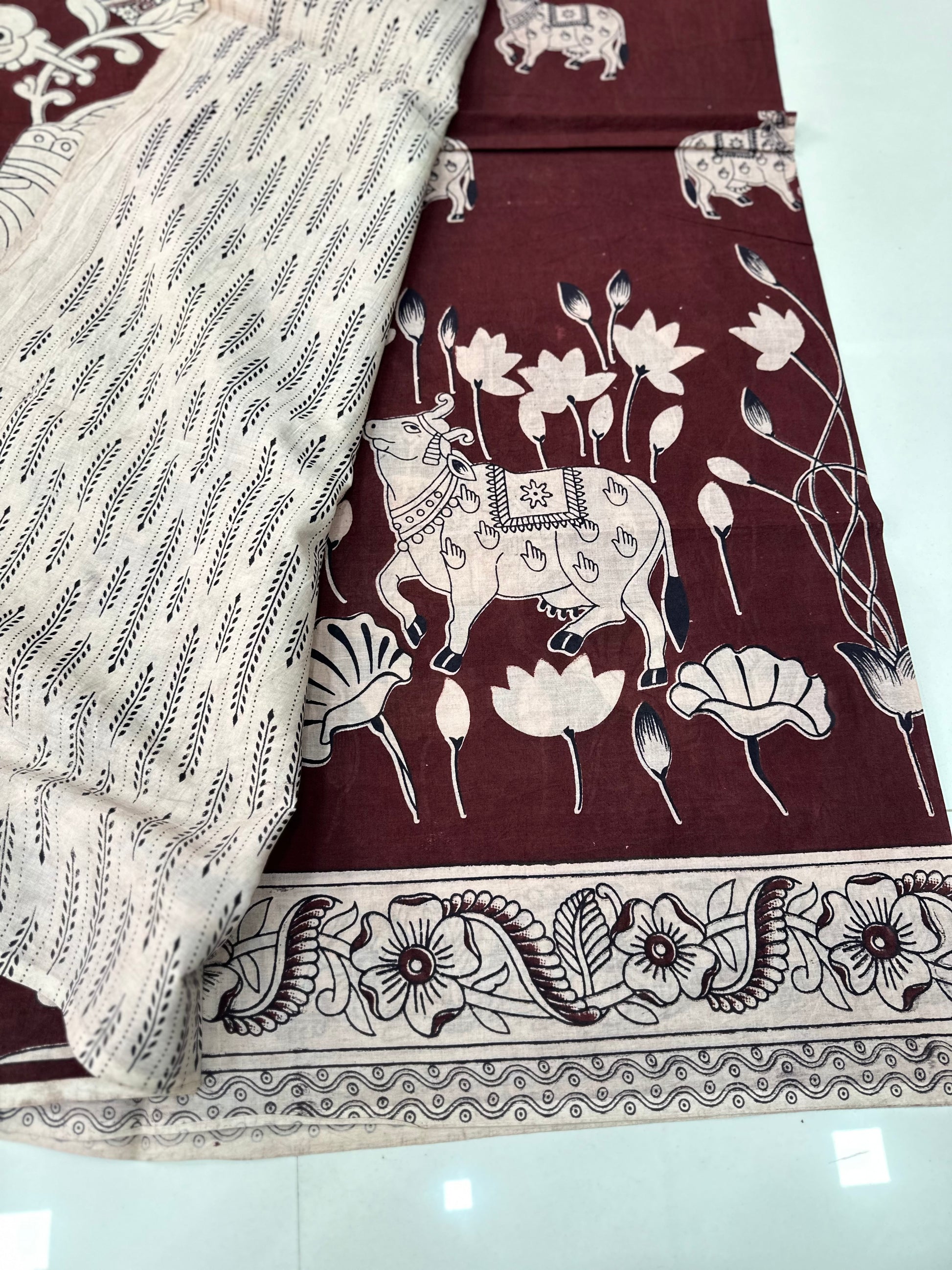 Experience the exceptional quality of our Kalamkari cotton sarees, meticulously crafted by skilled artisans using traditional techniques. Our premium cottons are sourced directly from our own manufacturing unit, ensuring authenticity and unbeatable softness. Immerse yourself in the rich heritage of Kalamkari art with our pure handmade sarees.