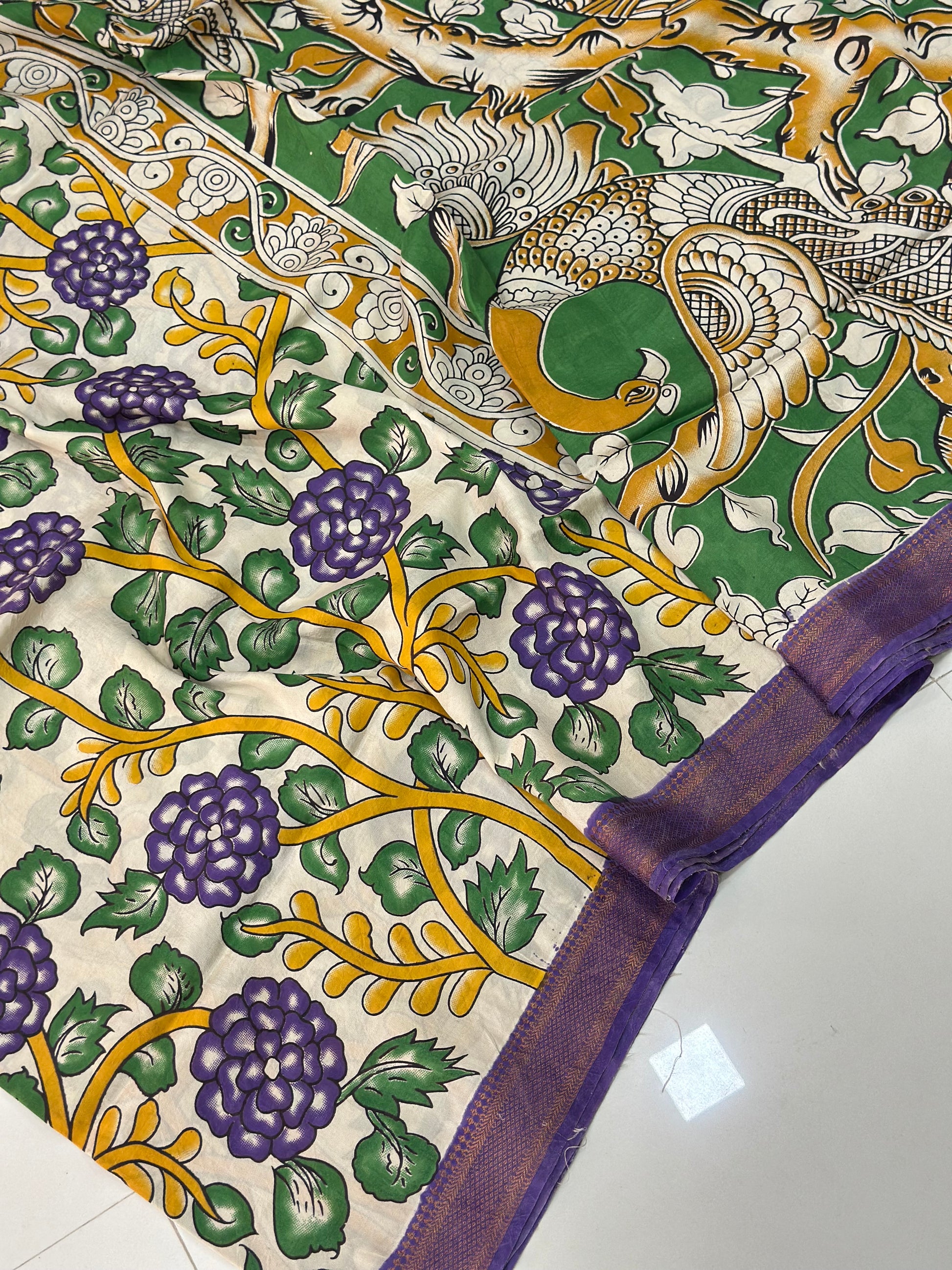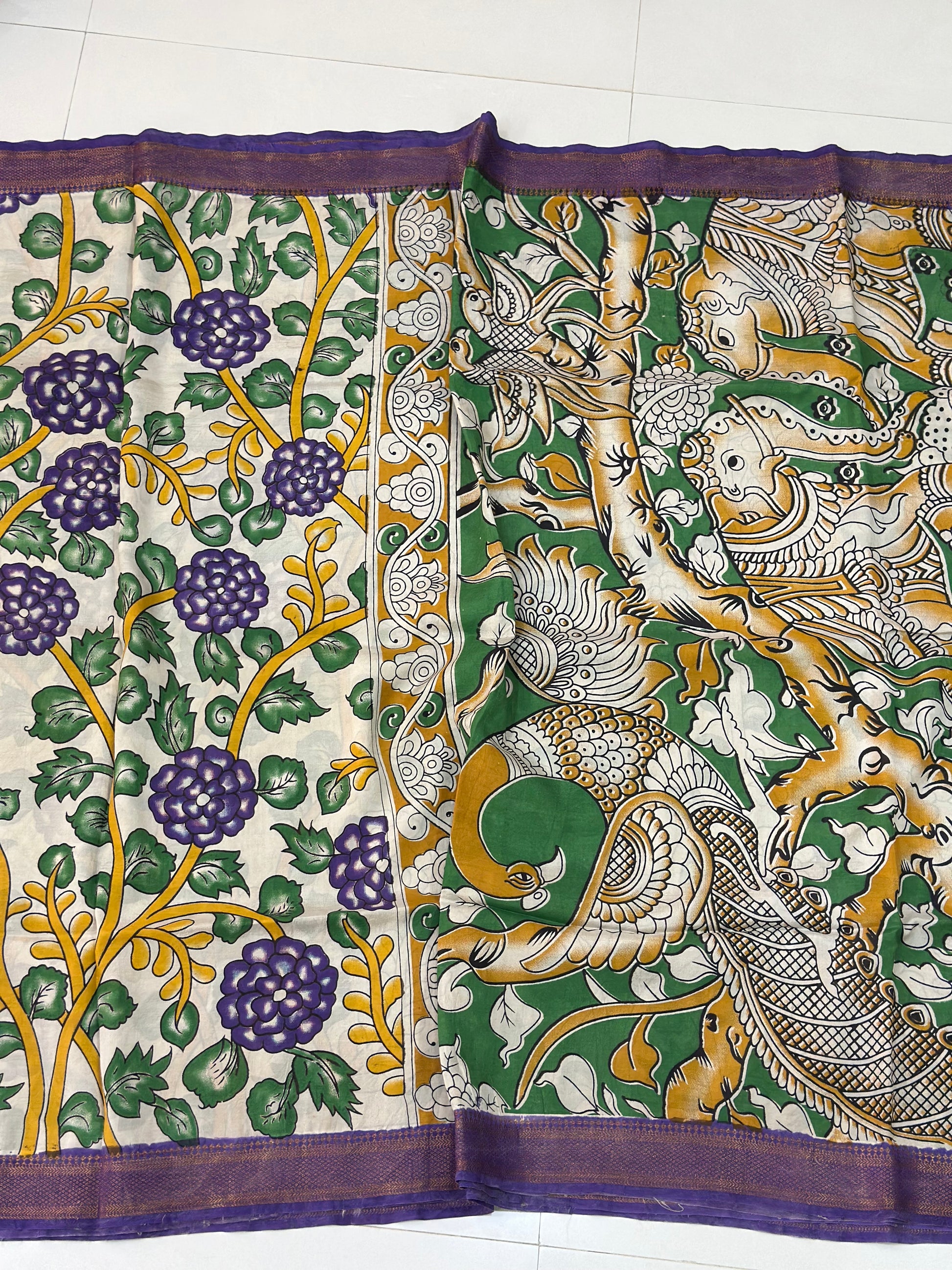 These Kalamkari silk sarees feature elegant nizam borders, crafted by hand by skilled artisans using natural vegetable dye colours.